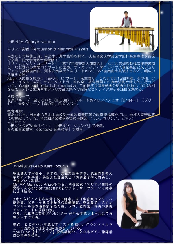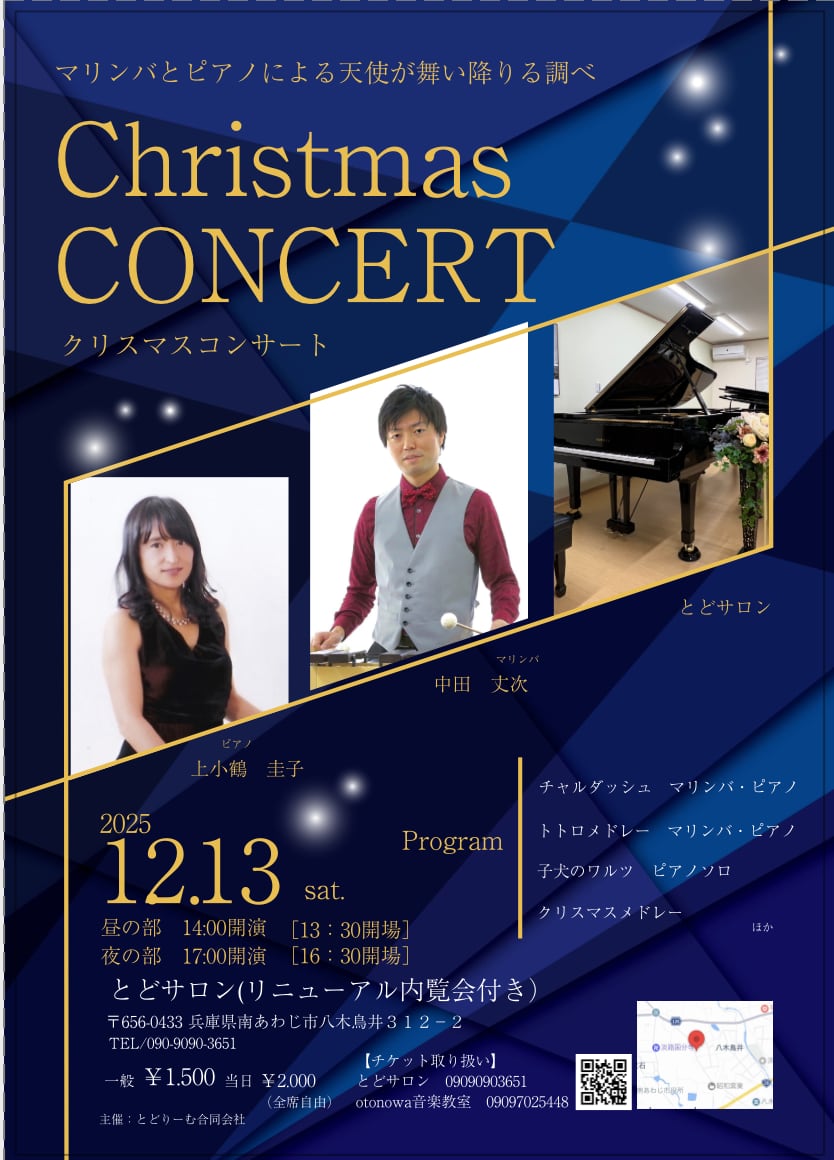 2025年12月13日、マリンバ奏者・中田丈次とピアニスト・上小鶴圭子による心温まるクリスマスコンサートが開催されます。この特別なイベントは、リニューアルオープンしたとどサロンで行われ、昼の部と夜の部の2回に分かれて、皆様に素敵な音楽をお届けします。2人のアーティストによる息の合った演奏が、クリスマスの雰囲気を一層引き立てます。ぜひ、この特別な夜を一緒に楽しんでください!