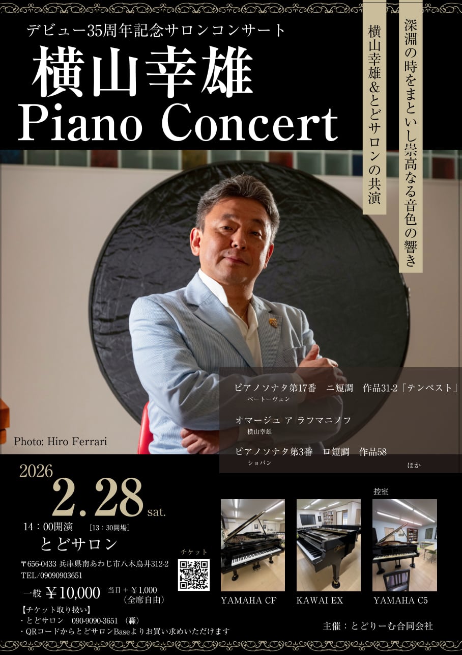 2026年、著名なピアニスト・横山幸雄がデビュー35周年を迎え、特別なコンサートをとどサロンにて開催します。このイベントでは、彼の豊かな音楽が生み出す感動が皆様の心を満たし、忘れられないひとときをお届けします。横山幸雄の洗練された演奏は、クラシックの名曲から新作まで幅広いジャンルを網羅し、聴衆の皆さんを魅了することでしょう。ぜひ、音楽の魔法に浸る特別な夜をお楽しみください!